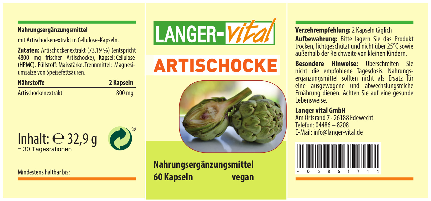 Zutaten: Artischockenextrakt (73,19 %) (entspricht 4800 mg frischer Artischocke), Kapsel: HPMC (Hydroxypropymethylcellulose), Füllstoff: Maisstärke, Trennmittel: Magnesiumsalze von Speisefettsäuren.