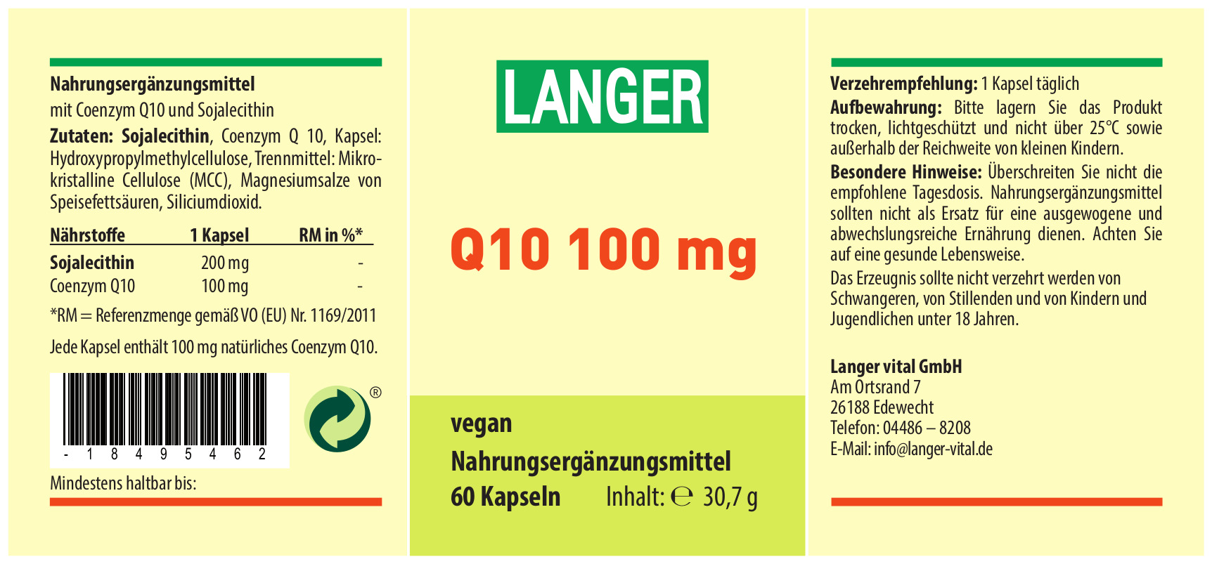 Zutaten: Sojalecithin, Coenzym Q10, Kapselhülle: Hydroxypropylmethylcellulose (HPMC), Trennmittel: Mikrokristalline Cellulose (MCC), Magnesiumsalze von Speisefettsäuren, Siliciumdioxid.