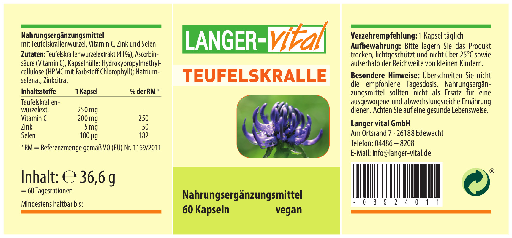 Zutaten: Teufelskrallenwurzelextrakt (41 %), Ascorbinsäure (Vitamin C), Kapselhülle: Hydroxypropylmethylcellulose (HPMC mit Farbstoff Chlorophyll), Natriumselenat, Zinkcitrat.